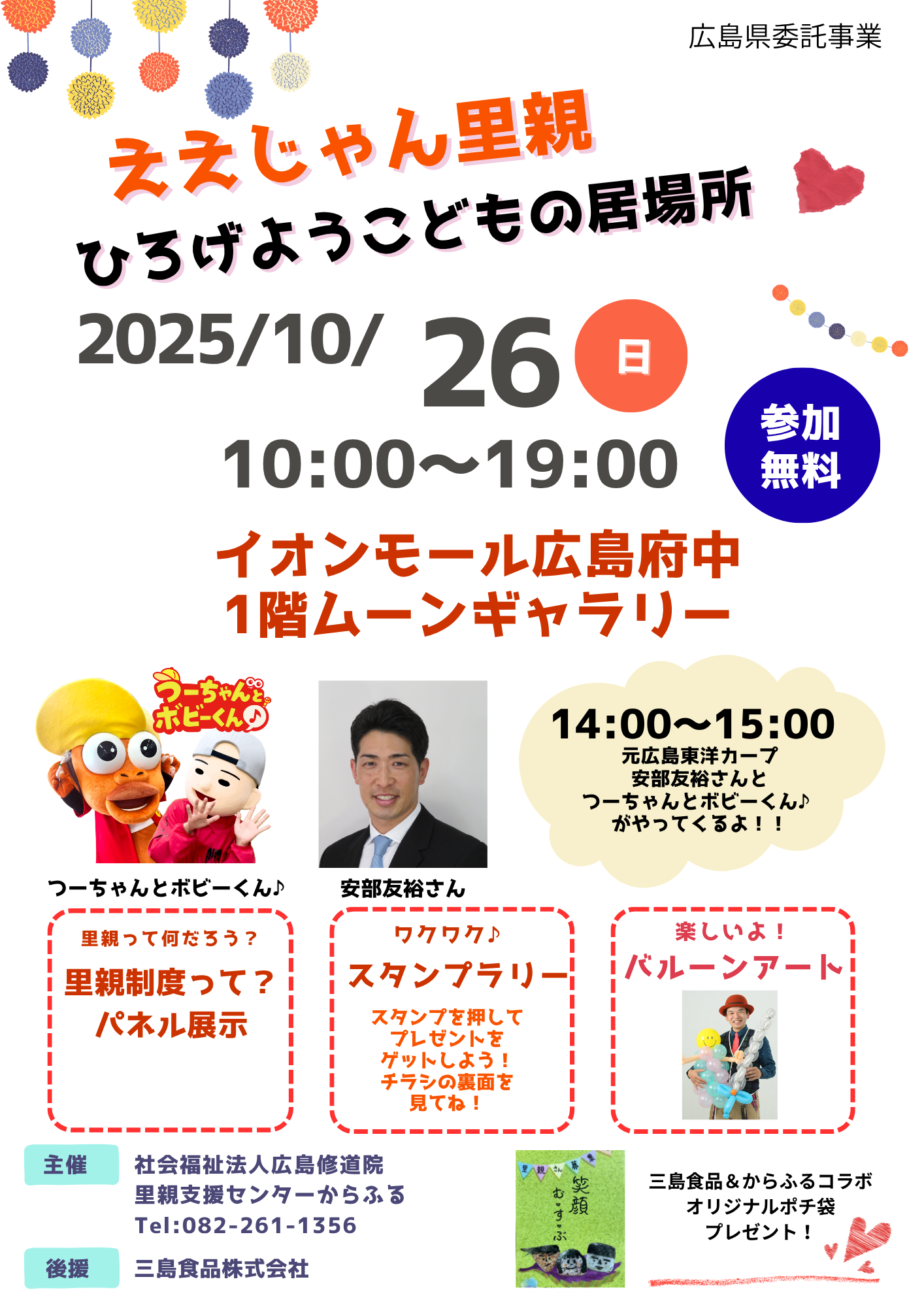 また、午後には広島県里親応援団長の安部友裕さん、「つーちゃんとボビーくん♪」が登場します!