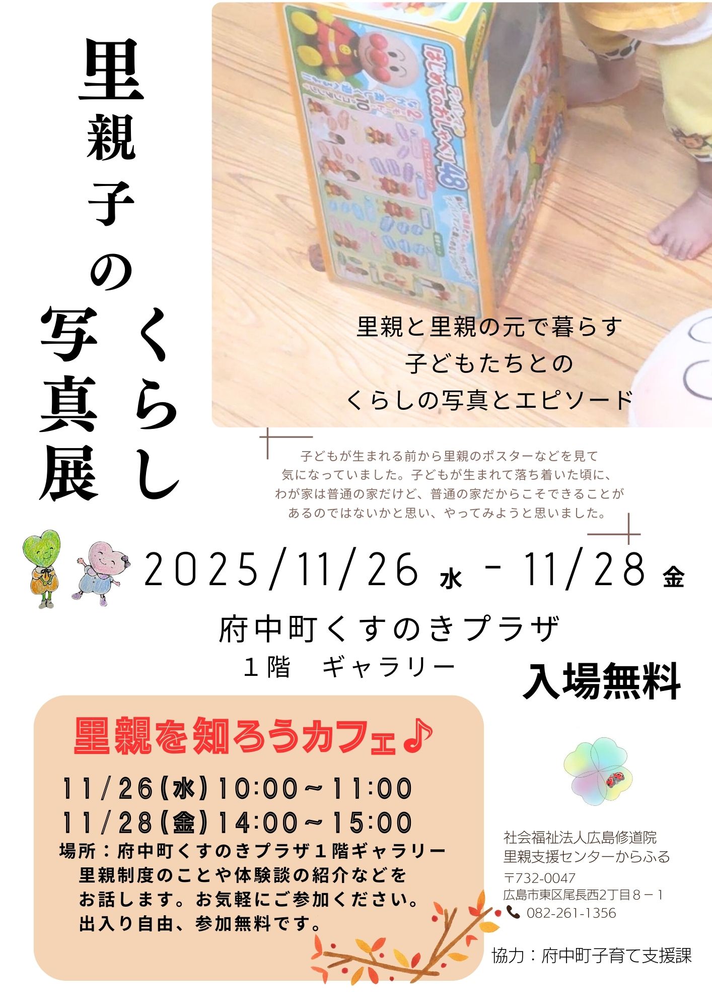 11月26日(水)~28日(金)には、府中町くすのきプラザ1階ギャラリーで「里親子のくらし写真展&里親を知ろうカフェ」を開催します。色々なカタチで活動されている里親さんと里親家庭でくらす里子さんのくらしの様子を映した写真とエピソードを多く展示しています。また、「里親を知ろうカフェ」では、里親制度の話や体験談を聞いていただいたり、質問もできますので気になった方はぜひご参加ください。